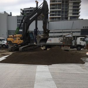 As the construction site is adjacent to the Brisbane River, the existing loose to medium dense sand subgrade did not have the required bearing capacity to withstand the proposed 370kPa piling pressures exhibited during operations. In order to achieve the required bearing capacity, GCS designed a platform using a combination of Combigrid® 40/40 geocomposite and Secugrid® 40/40 geogrid. The geogrid component in Combigrid® provides reinforcement whilst the integrated geotextile component provides a positive separation and filtration function. The Combigrid® geocomposite was placed on top of the weak subgrade and the Secugrid® geogrid layer was placed midway between the 800mm thick platform.